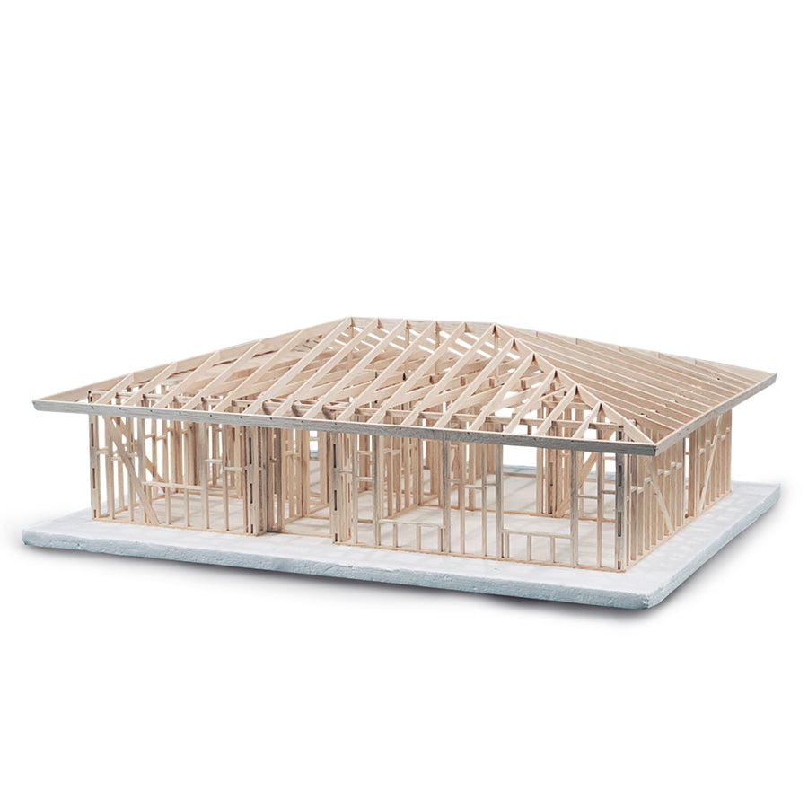 A 3/4” scale kit for a 1-Story, two bedroom home with a Hip Roof that teaches sound wood frame construction in accordance with accepted building codes. The builder(s) learn the fundamentals of house framing while sitting at a table.